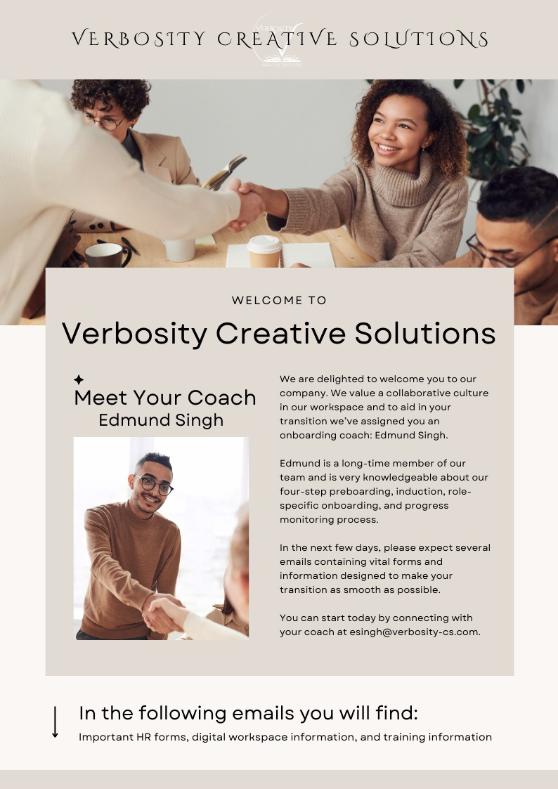 This project was designed with Verbosity Creative Solutions in mind. Our organization is hypothetically hiring a couple of junior eLearning professionals. As part of an initiative to make our team’s onboarding of new teammates easier and faster, we designed a brief email onboarding series for the new hires to acclimate them to their new roles.
